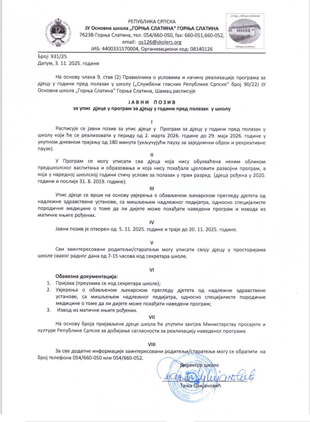 На основу члана 9. став (2) Правилника о условима и начину реализације програма за дјецу у години пред полазак у школу („Службени гласник Републике Српске“ број 90/22) ЈУ Основна школа „Горња Слатина“ Горња Слатина, Шамац расписује