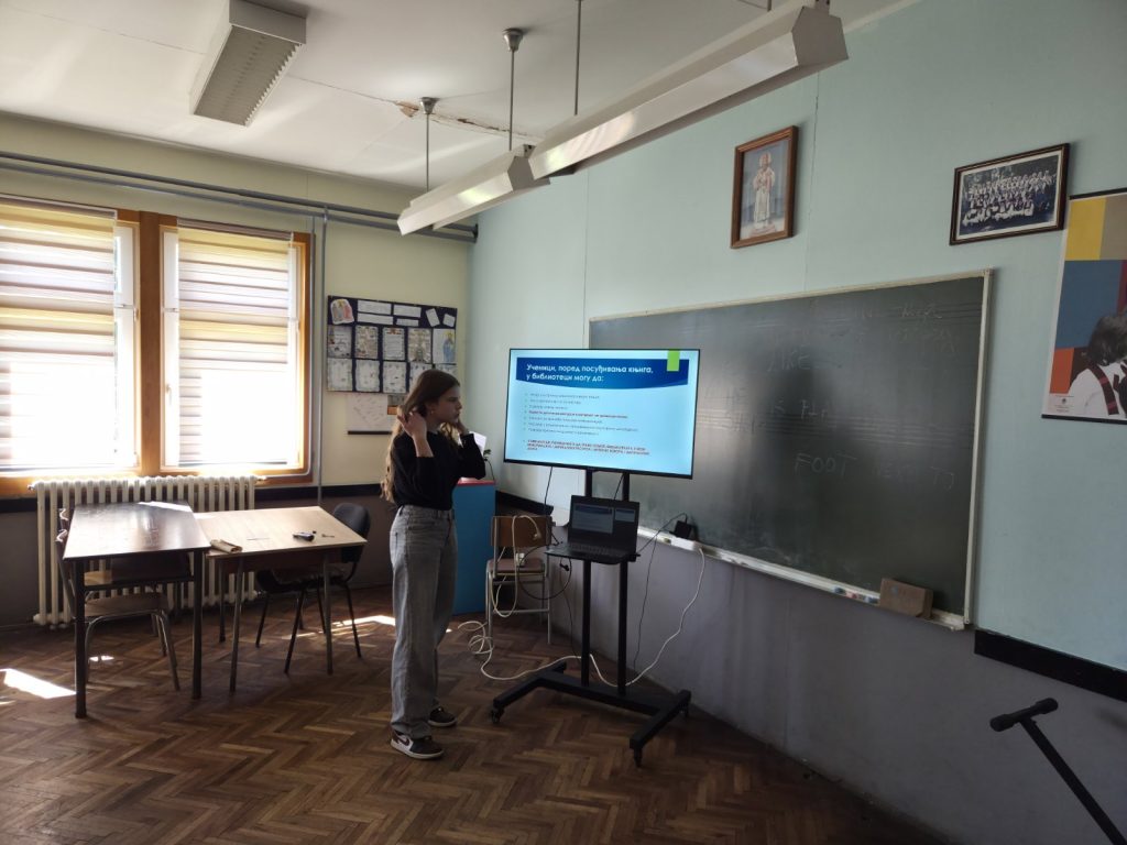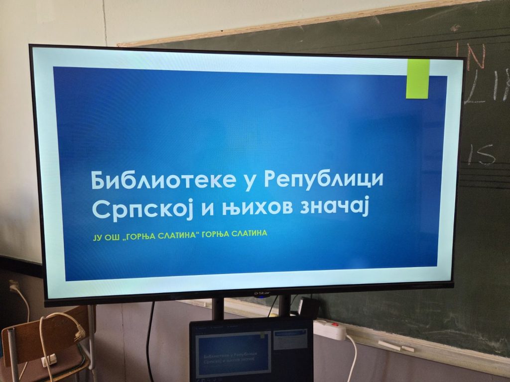 Кроз предавање ,,Библиотеке у Републици Српској и њихов значај“ ученици су упознати са структурном библиотека у Републици Српској и нашој општинињиховим значајем, са историјом школе и школске библиотеке, као и са значајем школске библиотеке кроз историју наше школе. Уз предавање,одржана је и радионица ,,Ја, библиотекар“ у којој су се ученици ставили у положај библиотекара и кроз дискусију, описали активности које би спроводилида су они библиотекари.