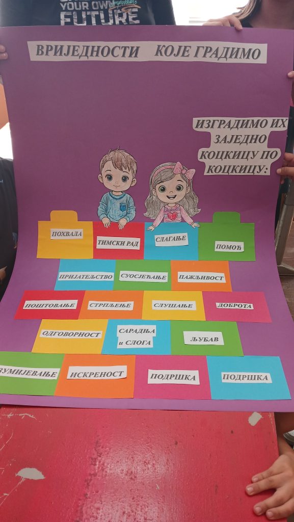 На часовима Васпитног рада – одјељенске заједнице разговарали су о вриједностима које доприносе изградњи бољих, љепших и чвршћих односа међу другарима у школи. У вези с тим направили су заједнички пано под називом „Вриједности које градимо“.Своја запажања и тежње пренијели су и кроз ликовне радове на часовима Ликовне културе, цртајући на теме „Моја школа – моја радост“ и „Другарство у бојама“. Најмлађи ученици 2. разреда направили су свом другару из клупе поклон у облику срца са поруком пријатељства.